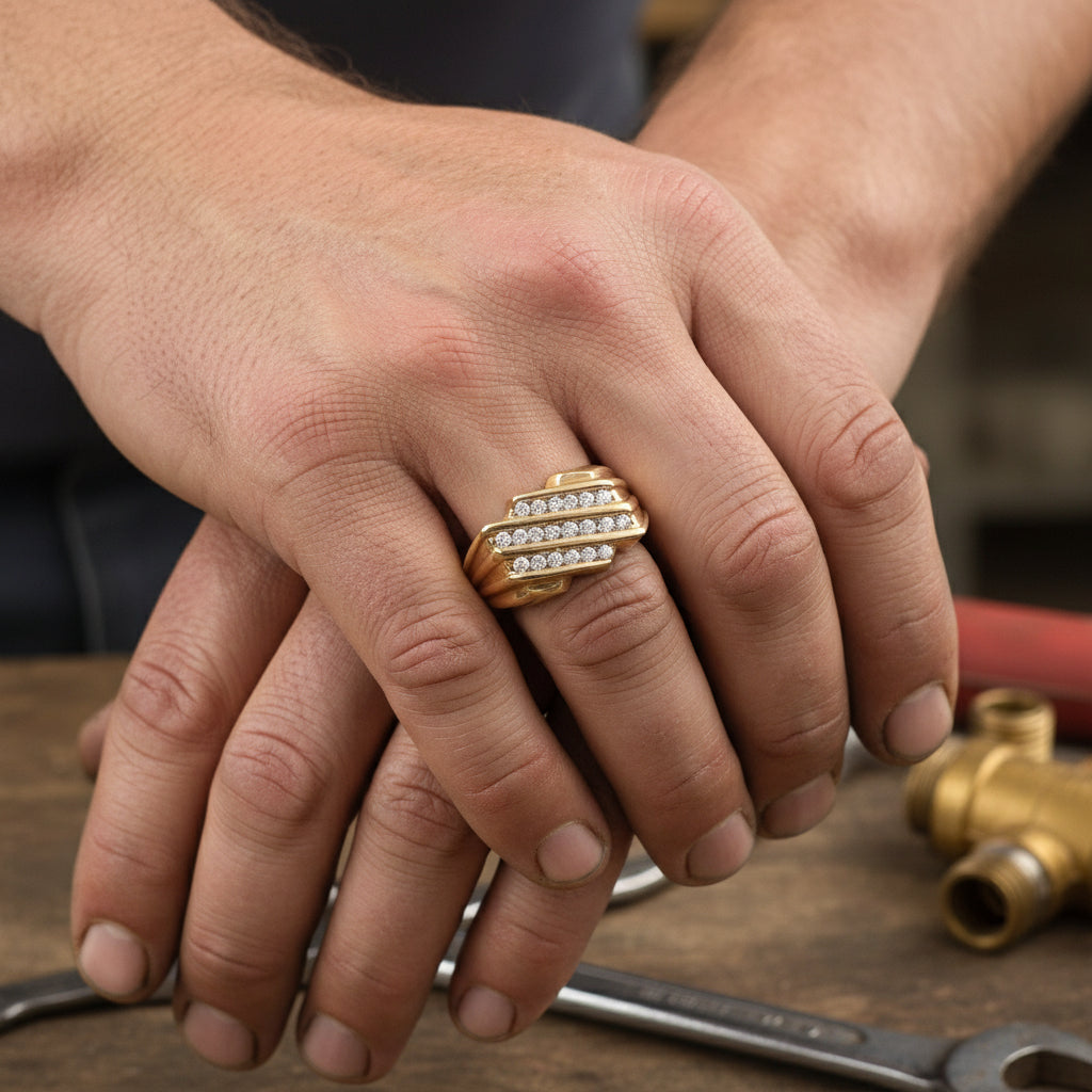 This substantial 14k gold men's ring showcases 0.5 carats of diamonds in GH color with I1 clarity, delivering impressive presence and character. At 5.48 grams, the band offers a bold, confident weight ideal for masculine styling. The durable construction and classic design make it perfect for daily wear, whether as a statement piece or meaningful keepsake that stands the test of time.