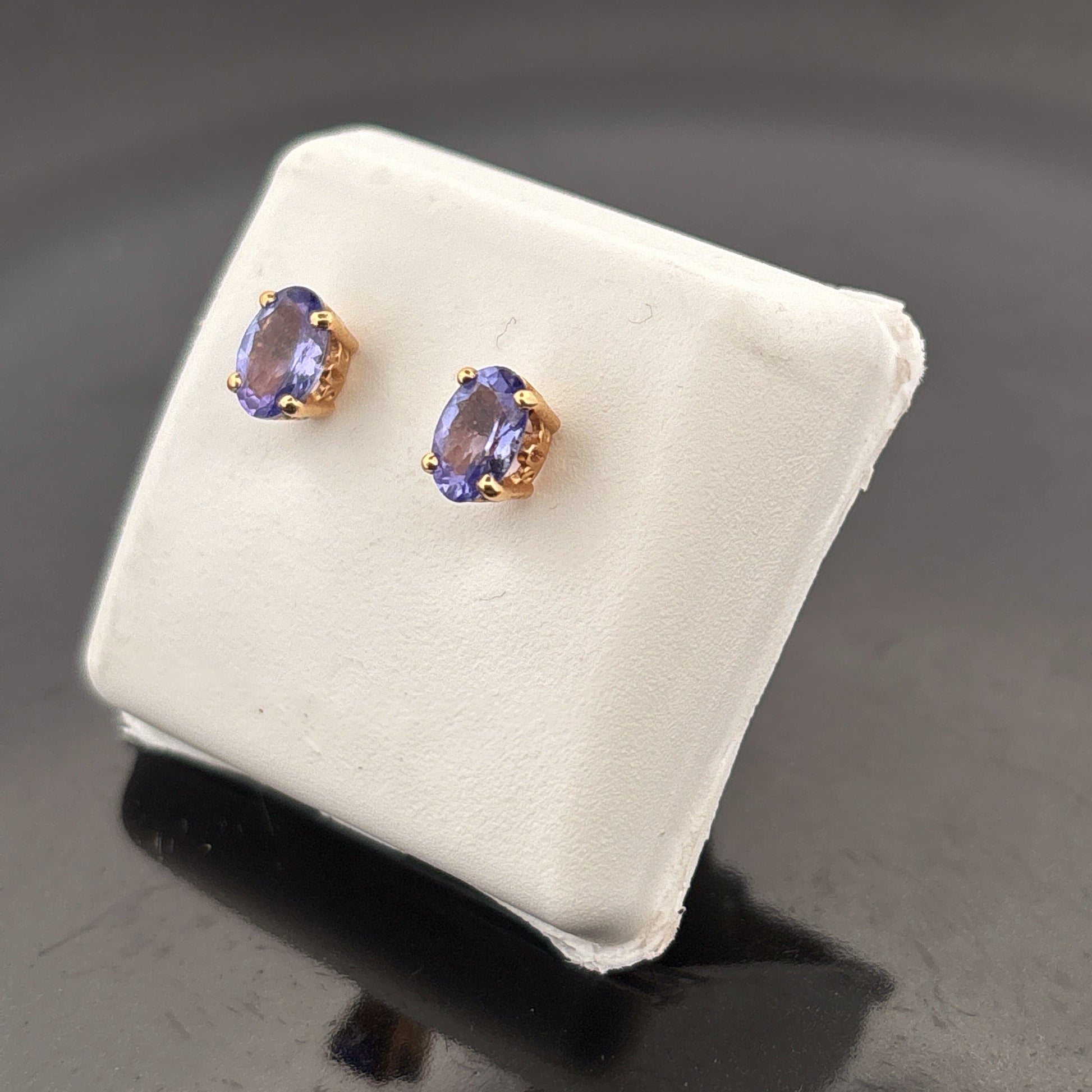 Elegant 14k gold tanzanite earrings featuring stunning oval-cut stones measuring 6x4mm. Each earring weighs 1.05 grams, offering a delicate yet substantial feel. Tanzanite's rich blue-violet hue makes these pieces perfect for adding sophisticated color to any jewelry collection. Ideal for everyday wear or special occasions, these earrings combine timeless design with the natural beauty of genuine tanzanite gemstones.