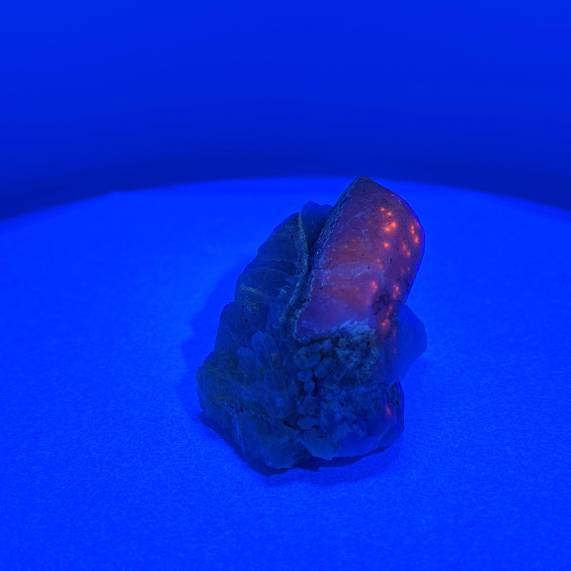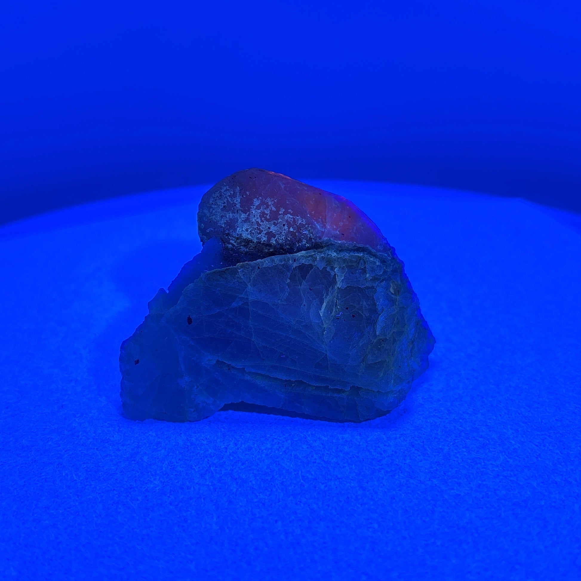 This exquisite specimen features fluorescent Hackmanite and Calcite naturally perched on a clear Quartz matrix from Pakistan, weighing 85.13 grams. Its rare combination of minerals offers a captivating display under UV light, revealing vibrant fluorescence that enhances its aesthetic and scientific value. Ideal for collectors and enthusiasts, this elegant piece embodies both geological beauty and unique luminescent properties.