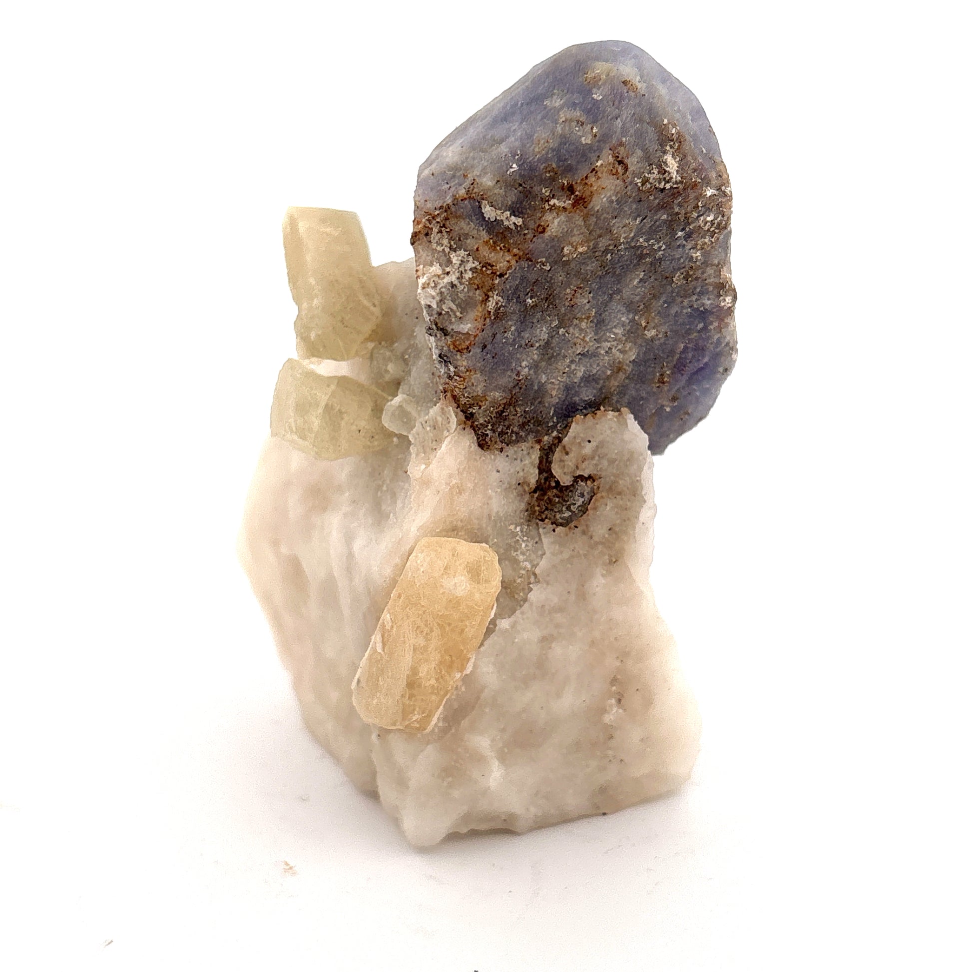 This rare specimen features fluorescent hackmanite and calcite beautifully perched on a quartz matrix from Pakistan. Weighing 149.58 grams and measuring 7 x 4 x 4.5 cm, it offers a striking combination of mineral luminescence and crystalline structure. Ideal for collectors and researchers, this piece highlights the unique properties of hackmanite’s tenebrescence alongside calcite’s vibrant fluorescence, all resting on the transparent elegance of quartz. Its exceptional provenance and quality make it a valuable addition to any advanced mineral collection.