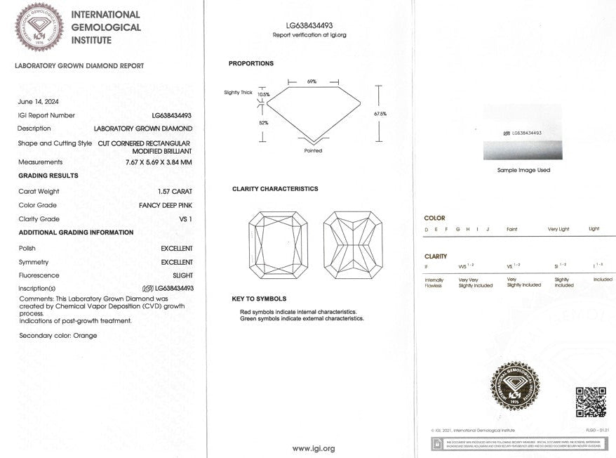 Discover the timeless elegance of this certified lab-grown diamond, a stunning 1.57-carat fancy deep pink stone with VS1 clarity. The sophisticated emerald cut showcases the diamond's exceptional color saturation and brilliance, making it an ideal choice for a meaningful engagement ring or heirloom piece. Ethically created and independently verified, this diamond offers the same optical properties and durability as mined diamonds while providing exceptional value. Perfect for those seeking luxury with integrity.