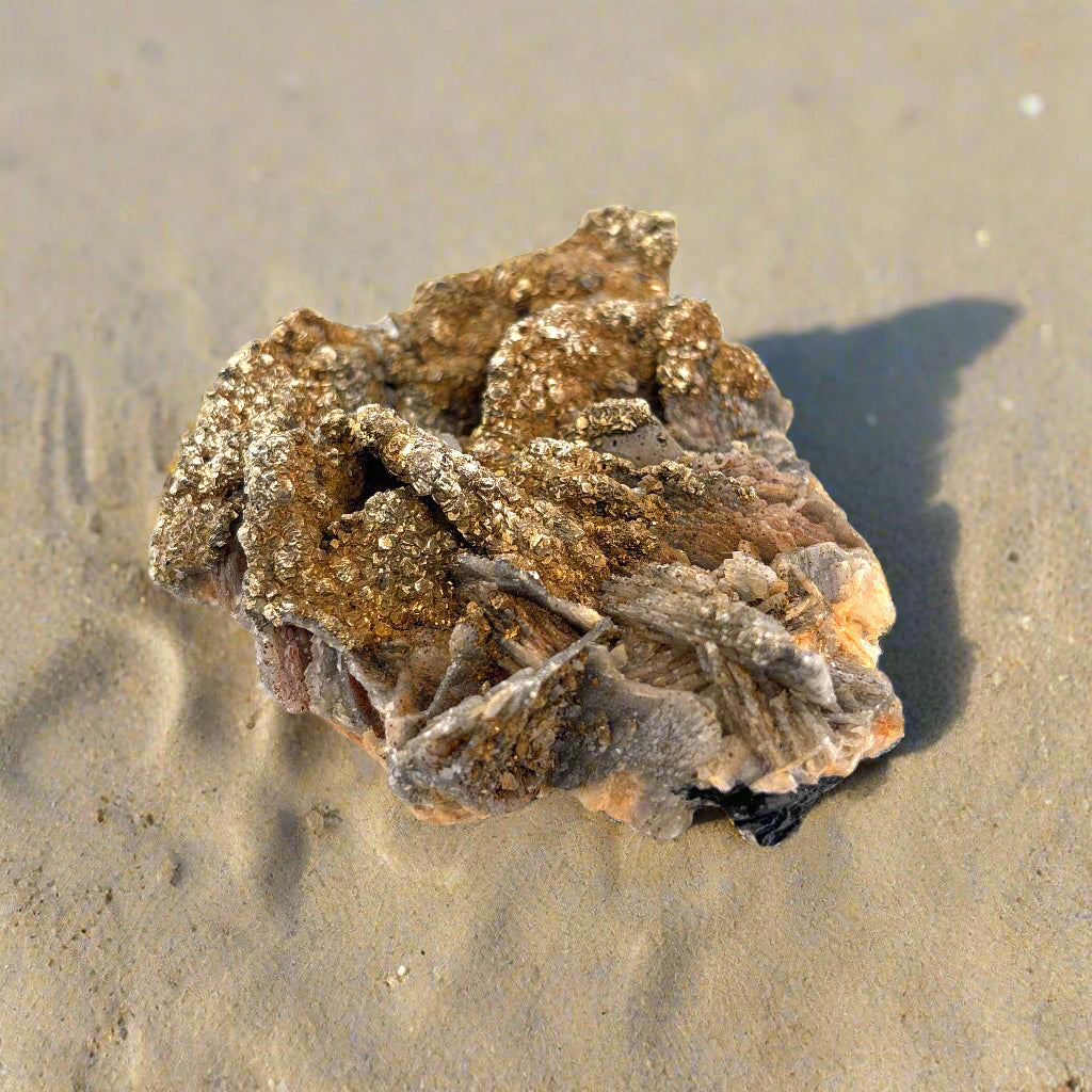 This specimen features bright pyrite crystals elegantly perched on a matrix of creamy calcite, sourced from Morocco. Measuring 7x7x2 cm and weighing 187 grams, it offers a striking contrast between metallic luster and smooth mineral surfaces. Ideal for collectors and geology enthusiasts, this piece exemplifies crystalline formation and mineral association with excellent hand sample dimensions.
